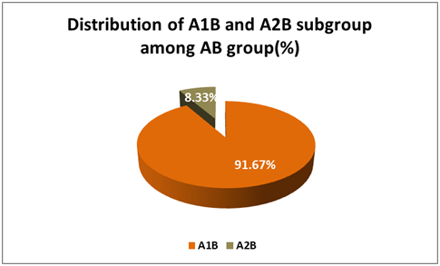 Results: Among the A group there are 93.42% A1 subgroup and 6.6% A2 subgroup. Among the AB group there were 91.6% A1B and A2B was 8.33%.