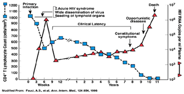 The primary infection period or primo-infection is characterized by an active viral replication, as well as an arousal of a specific immunological response against HIV-1 and the viremial control. This acute infection can extend itself from four to eight weeks, covering two stages. A first viral dissemination stage which culminates with the viremial peak during the first days after the infection, the virus is reproduced in great quantities by the lymphocytes, activated in the lymphatic nodules and is set free into the blood. The titles encountered can be above 5,000 infectious particles or 107 molecules of viral RNA per ml of plasma. During this period no specific antibodies against HIV-1 are detected and are hence termed window phase. During the first weeks, a transitory decline in the absolute number of T CD4+ lymphocytes in peripheral blood can be observed and high levels of plasmatic viral load. The second stageis characterized by the sudden viremial reduction which would correspond to the partial elimination of the virus in the blood concomitantly with the detection of specific antibodies against the virus that is with the seroconversion period accompanied by an increase in T CD4+ lymphocytes.