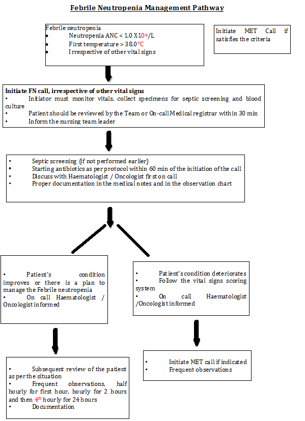 Intervention: A FN management pathway which included medical registrar review within 30 minutes and empirical antibiotics administration within 60minutes of fever detection. Main outcome measures: time from fever detection to antibiotic administration, ICU admission rates, mortality.