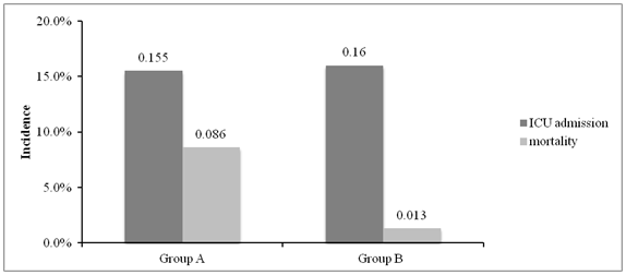 As part of the FN pathway at least two sets of blood cultures were taken from patients prior to administration of antibiotics. The percentage of patients with positive blood cultures was 34.5% patients in Group A and 27.6% of patients in Group B (p= 0.2). Culture results are detailed in Table 2. Five patients had multiple significant organisms grown from blood culture. Two patients grew multi-resistant organisms. One patient had bacteraemia was due to vancomycin resistant Enterococcus faecalis and another due to extended spectrum beta-lactamase (ESBL) Escherichia coli. Both of these patients were in Group B. The mean time to initiate antibiotics was 242.8 minutes (95% CI: 0-931) in Group A and 69.7 minutes (95% CI: 0-219.5) in Group B (p=0.005; Figure 2). The proportion of patients who received empirical antibiotics within 60 minutes improved from 37.9% in Group A to 66.7% in Group B (p=0.001). ICU admission rates were similar between the groups with a rate of 15.5% in Group A and 16.0% in Group B (p= 0.87). There was a reduction in the mortality rate in Group B (1.3%; n=1) compared to Group A (8.3%; n=5), however this was not statistically significant (p=0.11; Figure 3).