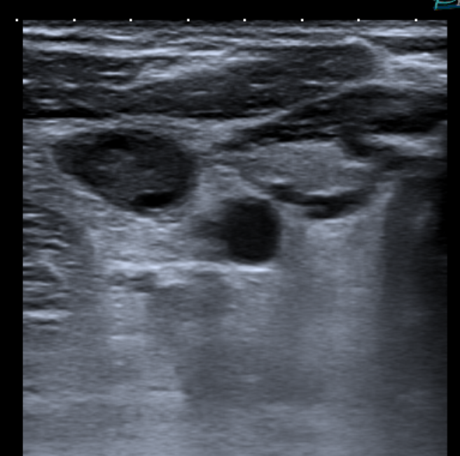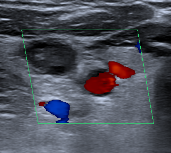Thrombophilia studies revealed Hyperhomocysteinemia of 17.2 μmol/L (normal values 3.0 - 15.0), Total Protein S 54.1 % (normal values 65.0 - 140.0), and weak positiveness of a lupic anticoagulant. Six months after the episode, all parameters were normalized. Doppler ecography was done, in which an incidental jugular vein thrombosis was discovered (Figure 3 & 4).