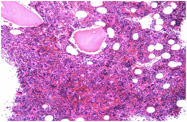 PMF is a progressive disease characterized by predominantly megakaryocytes and granulocytes in the early stages of marrow involvement with eventual development of reticulin and/or collagen fibrosis and eventual osteosclerosis. Thirty percent of patients are asymptomatic at time of diagnosis; disease is suspected when a patient presents with splenomegaly or peripheral blood counts revealing anemia, leukocytosis and or thrombocytosis. Bone marrow failure, thromboembolic disease, AML is major causes of morbidity and mortality. Bone marrow biopsy provides not only diagnostic information but also clues for prognostication. Higher grades of bone marrow fibrosis indicate more advanced disease and poor prognosis. Diagnosis of PMF requires the presence of all 3 major criteria and 2 minor criteria.