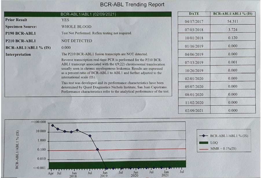 The fusion of the Abelson murine leukemia gene (ABL1) on chromosome 9 with the breakpoint cluster region (BCR) gene on chromosome 22, known as the Philadelphia chromosome, has been postulated as the etiology of the chronic myeloid leukemia (CML). This translocation results in the expression of the oncoprotein called BCR-ABL1, causing leukemogenesis with a cell cycle and aberrant cytosine production.1 The recognition and measurement of this oncoprotein helps with the diagnosis and monitoring -the therapeutic response in patients with this disease.2