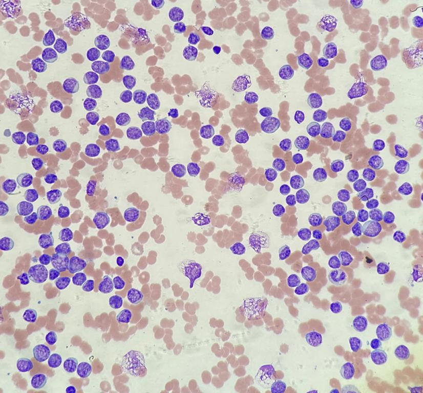 This is the case of 37 years old male who presented with leukemic blasts in his peripheral blood. CBC report showed total WBC of 330×109/L, markedly increased white blood cells (normal range is between 4.0–11.0×109/L), Hb level (Hemoglobin level) is 7.5 g/dl, moderately reduced (normal range is between 13.5-17.5g/dl), while platelets count is 29×109/L, moderately reduced (normal range is between 150-450×109/L ). Morphological examination showed heavy infiltration by around 95% leukemic blasts. Bone marrow examination, conducted later & showed Hyper cellular packed. Bone Marrow particles and trails, due to massive infiltration by monomorphic blasts, that are small to moderate in size with high N/C ratio, the nuclei are round with slightly open chromatin,1-2prominent nucleoli, slightly basophilic cytoplasm with no granules or Auer rods (Figure 1).