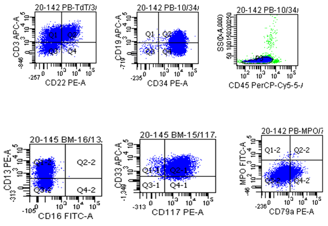 Immunophenotyping was done from both peripheral blood & bone marrow aspirates & showed positive antibodies for the following antigens: CD34. ,CD38,CD117, ,CD13 CD33,CD11b, HLA-DR, C-CD3 CD7, CD4 ,C-CD22, ,C-CD79a, CD19, CD58, while negative for the following :CD10, CD15,TdT, CD14, CD64, CD36, CD11c, CD56, CD16, CD2,s-CD3, CD8, TCRA/B, TCR G/D, CD5, CD1a, CD99 &CD20 (Figure 2).