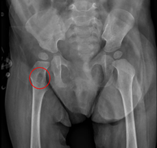 A previously healthy 11-month-old female presented to the clinic with a progressively enlarging retroauricular mass on the left side, noted by her parents for the past two months. There was no associated lymphadenopathy, and the remaining physical examination was unremarkable. Initial laboratory investigations, including complete blood count and inflammatory markers levels, were within normal limits. Given the persistent nature of the mass, biopsy was performed. Histopathological analysis of the biopsy specimen revealed proliferation of atypical cells. Immunohistochemical staining was inconclusive, and further imaging was warranted to characterize the lesion. A metastatic bone series was ordered, revealing two small osteolytic lesions in the neck and right intertrochanteric region of the femur, measuring 1.28 x 0.53 cm and 0.51 x 0.19 cm, respectively (Figure 1). Based on these findings, a preliminary diagnosis of a malignant process, such as a rhabdoid tumor, was considered.