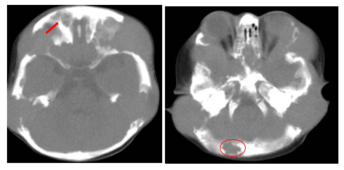 Langerhans cell histiocytosis (LCH) is a rare clonal disorder of the monocyte-macrophage system characterized by the accumulation of pathological Langerhans cells. Mutations in the MAPK signaling pathway, particularly the BRAF V600E mutation, are believed to play a crucial role in the etiology of LCH.1 LCH presents with a wide clinical spectrum, ranging from single-organ involvement to aggressive multisystem disease. Bone involvement is common in children, particularly in the skull.2 Diagnosing LCH can be challenging because of its overlap with other conditions such as infectious osteomyelitis or malignancies.3 Radiologically, osteolytic lesions, as seen in this patient, are hallmark features of LCH, but they are not specific. Several conditions must be considered as part of the differential diagnosis. Infectious osteomyelitis, for example, can mimic LCH radiologically and clinically, particularly in the presence of systemic signs of infection. Malignancies such as Ewing sarcoma and leukemia can also present with lytic bone lesions and systemic symptoms, requiring careful evaluation of imaging, laboratory results, and biopsy findings.4