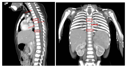 Figure 3A&3B Thoracic CT of the patient revealed lytic lesions in the vertebral bodies of T1, T3, T4, T6, and T7, along with pathological fractures of T5 and T9.