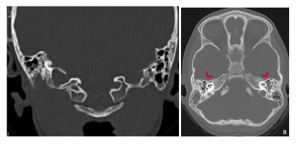 Figure 4A&4B Mastoid CT of the patient revealed total opacification of the remaining mastoid air cells and loss of morphology of both mastoid portions of the temporal bone.