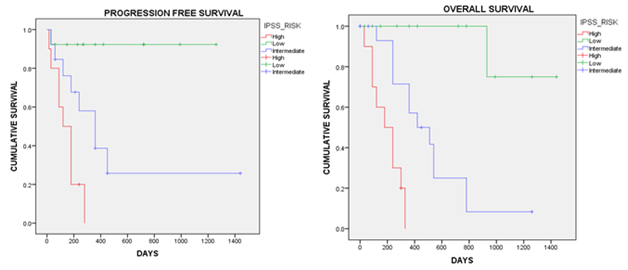For high risk patients the outcome after allogeneic sibling donor stem cell transplantation has improved a bit in last few years due to reduced non relapsed mortality but a 5-year relapse rate is still significantly high- 44% for RAEB and 52% for RAEB-t.18 Also the use of azacitidine and decitabine in the treatment of higher risk MDS has improved survival up to 50% in patients who used to have very poor survival.19,20 This reflects in the Spanish data presented in annual ASH meeting in 2012 where median overall survival rates are 113.7months in very low risk, 60.3months in low risk, 30.5months in intermediate risk and 21.2months in high risk IPSS-R cases (Table 8).21