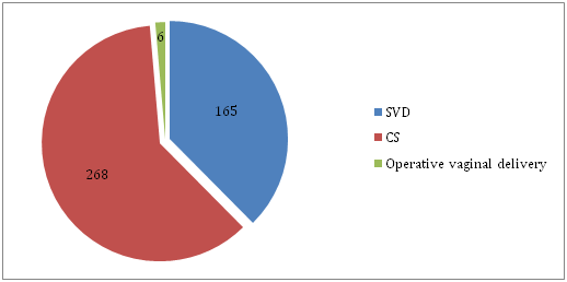 There was history of previous CS in 106 (18.8%) women and out of these, 83 (78.3%) had CS done only once while just 2 (1.8%) had undergone CS three times before. Transfusion rate was higher 268 (61.0%) among patients who delivered through CS compared with 165 (37.6%) who had spontaneous vaginal delivery (Figure 1). A higher proportion, 214 (48.7%), of the obstetrics patients that were transfused during delivery had Emergency Caesarean Sections (EMCS), more than one-third 165 (37.6%) delivered via spontaneous vaginal delivery, 54 (12.3%) delivered via elective CS (ELCS) and only 6 (1.4%) had operative vaginal delivery.