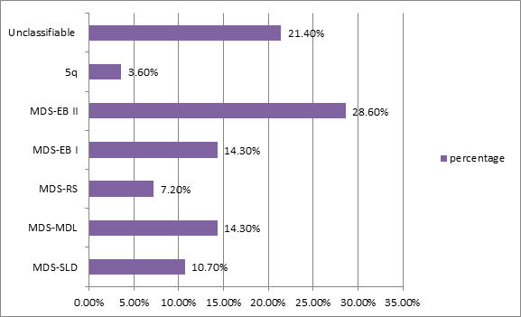 According to WHO classification (2016) , MDS with single lineage dysplasia (MDS-SLD) is found in 10.7% , MDS with multilineage dysplasia (MDS-MLD) is found in 14.3%, as well as MDS with excess blast-1 (MDS-EB-I) is found in 14.3%, MDS with excess blasts-II (MDS-EB-II) is found in 28.6%, but MDS with isolated del (5q) is found in 3.6% (Figure 1). The risk stratification for all patients was measured according different scoring systems, as showed in Table 2. Cytogenetic study was documented in 6 patients, 4 are with normal karyotype, 1 monosomy 7, 1with 5q deletion.