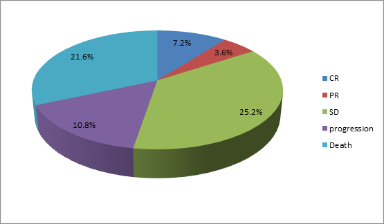 *These percentages represented the patients who reached to final outcome (best response, progression and death), collectively 68.4% of total patients. The remainder 31.6% include those who got initial response (HI), those who didn't respond, lost patients and those who are not evaluated yet.
