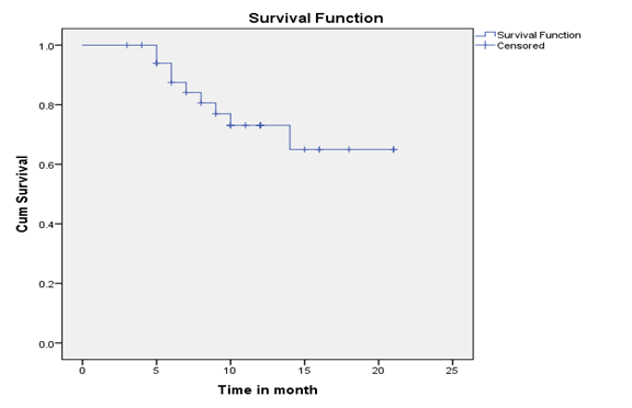 The overall survival (OS) was 64% and the mean months of survival was 16.7 months, the mean survival refers to the average number of months that people survive after being diagnosed with MDS (Figure 3). Test of equality of survival distributions for the different levels of risk stratification was no significant between different levels of risk stratification(p=0.5), the mean survival in high risk was 19.2 months, in intermediate was 14.1 months while in low risk 11.8 months (Table 4) (Figure 4).