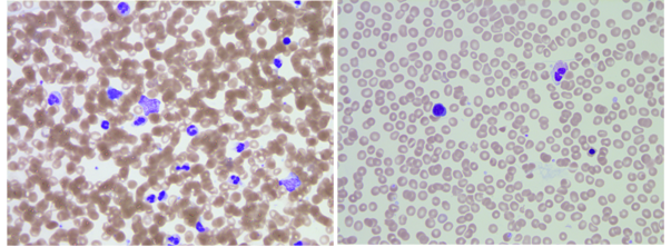 Determination of an accurate blood group is an essential and crucial step for subsequent transplant decisions. The transplant team requested blood bank help to figure out the patient’s blood group. Repeat testing of a peripheral blood sample would be of no value as he was still receiving group O red cells and AB plasma. ABO antigens can be detected on red cells of embryos as early as 5 to 6weeks of gestation.3 The possibility of B antigen expression on erythroid precursors was investigated on bone marrow stem cells.4 A previous local project was done to assess for the possibility of using bone marrow specimens as alternatives to peripheral blood samples. This was based on the fact that some samples were drawn from an intraosseous line in certain situations when an intravenous line is not accessible. The results showed >95% concordance between both specimens (AABB abstract # SP279). A bone marrow aspirate was obtained from the left posterior iliac crest; additional specimens were drawn for viral serology (HIV, Hepatitis B and C viruses). Using the bone marrow aspirate, the reverse grouping showed clear-cut group A but the forward typing was completely negative. Review of H&E stained slides revealed aparticulate aspirate but adequate cellularity. Predominance of granulocytic elements with only rare erythroid precursors were seen on scanning (Figure 1). The absence of sufficient erythroid precursors likely contributed to these reactions. Other plausible explanation is the presence of donor red cells through bone marrow sinusoids and/or peripheral blood contamination.
