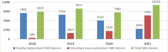 The total number of whole blood (WB) donations through the study period indicates a clear drop during the year of peak of COVID-19 pandemics in 2020. However, there is a steady increase in number of voluntary non-numerated whole blood donors, starting by 4.8% of total whole blood donations on 2018 to be 69.5% for 2021 (Figure 1). There is a constant increase on collection of platelets units using apheresis throughout the study period, 1305 units for the year 2018 to 1315 units for year 2021, with obvious increase in 2020 to compensate the drop in whole blood donations (Figure 2). All apheresis platelets donors are voluntary non-numerated donors and all are male donors.