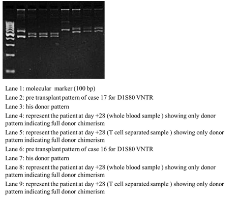 Selecting the most informative VNTR locus is the main key in chimerism analysis.3,12 In this study, we enrolled seventeen patients with their HLA identical siblings. We studied the potential value of various VNTR in the detection of chimerism status post-transplantation. We found that D1S80 VNTR was the most informative allele. D17S30 VNTR and YNZ22 VNTR showed similar discriminative power which is expected as D17S30 VNTR and YNZ 22VNTR are both located on chromosome 17p13. Scientists now are considering YNZ 22 VNTR as part of D17S30 VNTR.13,14 Apo B VNTR and 33.6 VNTR were informative to some extent.