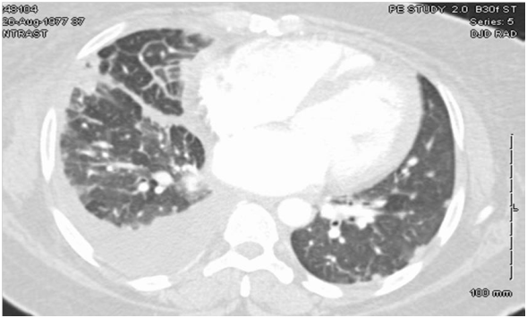Physical Examination revealed tachycardia with displaced point of maximal impulse (PMI) and minimal rhonchi on right lung base. Laboratory workup did not show any significant results on presentation. Chest X-ray showed bilateral interstitial infiltrates with areas of fibrosis and the chest CT Angiogram (Figure 1) showed bilateral scattered pulmonary nodules and densities, a right-sided pleural effusion, pleural thickening and cardiomegaly.