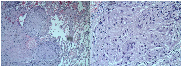 TTE showed EF of 25% with type III advanced diastolic dysfunction, further cardiac workup was done. This included cardiac catheterization which showed normal coronaries and an electrophysiological study for inducible arrhythmias which was negative. She was offered a lung biopsy; the pathology revealed classic non-caseating granulomas as shown in Figure 2.