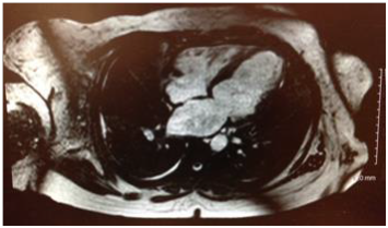 The patient was referred for a cardiac magnetic resonance imaging (MRI), which showed Left Ventricle (LV) dilation and severe LV dysfunction. The contrast study showed diffuse contrast late enhancement with patchy and confluent patterns characteristic of myocardial infiltrative process Figure 3.