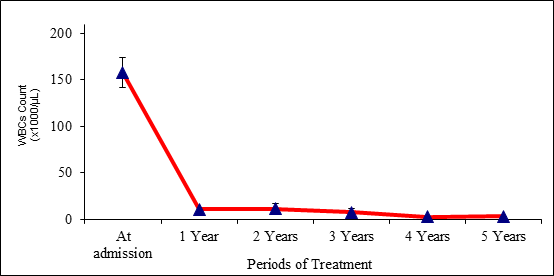 The mean value of WBCs for CML-diagnosed cases at admission was [157x103] with a standard error [SE] of [±16.3], and then by the time of continuous treatment, the total number of WBCs had been reduced to low numbers with the mean value/SE of [10.5±2.3], 11.2±5.9, 7.6±4.1, 2.4±0.5, and 2.9±0.1 during the period of 4–5 years of treatment, respectively, with a high significant value [P value = 0.0001], which means that the effect of the treatment on the number of WBCs was high (Table 2 & Figure 2).