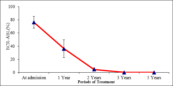 It is worth mentioning here that the investigation of cytogenetics, bone marrow analysis, and fluorescence in situ hybridization can be used to detect minimal residual disease in patients in cytogenetic remission, but it is not as sensitive as RQ-PCR and requires cells to be in metaphase.31 Accordingly, because the cytogenetic response correlates well with the duration of treatment,5 we think that the treatment strategy used in both oncology institutes lacks precision as it is largely randomized and more experimental than following a specific treatment plan. This proves the fact that the treatment strategy must be modified to meet the international standards required to treat such cases. Currently, data and results collected from different studies strongly suggest that intrinsic sensitivity to imatinib is variable in previously untreated patients with CML, and the level of Bcr-Abl kinase inhibition achieved is critical to the imatinib response.