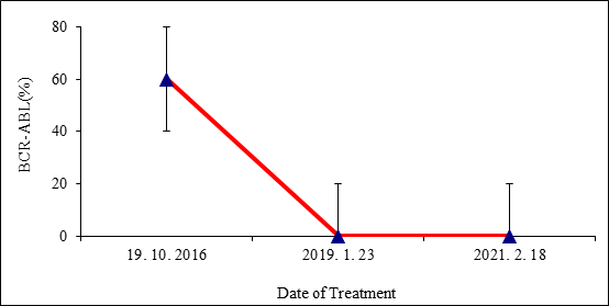 In order to follow up on the different stages of treatment and to know the progress of the disease during the treatment period, a random patient file has been chosen to be considered as a typical case [as an example of treated CML patients in Libyan oncology institutes] and to determine the diagnostic and treatment plan followed in these institutes during the same period mentioned above [2016–2021]. Moreover, all data from investigations such as hematological, cytogenetic, and molecular diagnostics have been collected and statistically analyzed by dividing the treatment period into six periods, as will be discussed later.