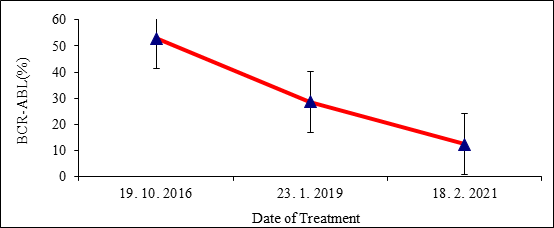 Conversely, the other case was admitted to the oncology institute [MOI] on November 11, 2019, with a BCR-ABL of 53.0%. At that time, the treatment dose was 600 mg IM. The reduction in the percent of BCR-ABL has decreased to 12.4% within about 2 months by using the same dose of IM [600 mg] (Table 6 & Figure 5).