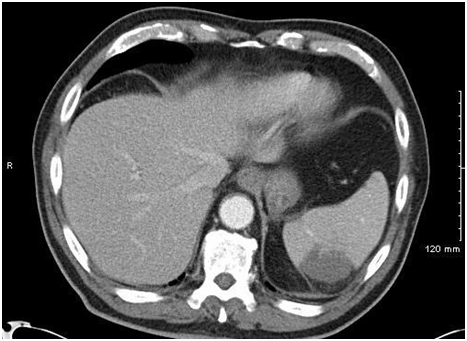79 year old Hispanic male with past medical history of HTN and osteoarthritis presented to the emergency room complaining of left side abdominal pain for three days and intermittent confusion. Physical examination was unremarkable apart from fluctuating mental status and left lower quadrant tenderness on palpation of abdomen. Initial laboratory investigations revealed anemia, thrombocytopenia, elevated bilirubin but normal liver enzymes and lipase. The peripheral blood smear showed schistocytes. Imaging studies including abdominal Computed Tomography (CT) scan demonstrated a wedge-shaped hypo-enhancing lesions in the spleen typical for splenic infarcts as shown in Figure 1 and a brain CT scan was unremarkable.
