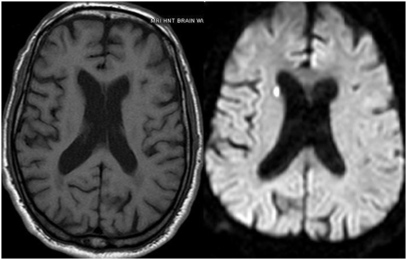 Plasma exchange was initiated immediately along with systemic steroids. Platelets counts improved, the patient remains afebrile and hemodynamically stable but his altered mental status persisted. Further workup for his persistent change in mental status revealed multiple bilateral acute lacunar infarcts on Magnetic Resonance Imaging (MRI) of the Brain as shown in Figure 2, which is likely embolic in etiology.