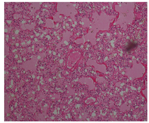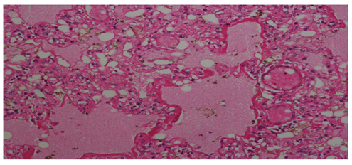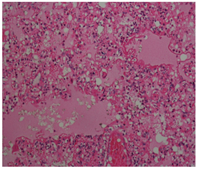 Figure 1 Edema, atelectasis, hyaline membranes, haemosiderin-loaded macrophages in large areas in the lungs, acute respiratory distress syndrome (HEX100, HEX200, HEX400).