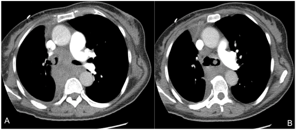 A 53-year-old woman presented to the emergency department with massive hemoptysis and respiratory failure. She had had history of intermittent hemoptysis and worsening shortness of breath during the last year. Her past medical history was remarkable for recently diagnosed lung cancer, two months previous to the admission. A metastatic poorly differentiated lung adenocarcinoma was reported in pathology from another medical center. On admission she required or tracheal intubation. The physical examination was, otherwise, unremarkable. She was hemodynamically stable and did not require vasopressor. Platelets and coagulation studies were in the normal range. A chest CT-scan with contrast showed evidence of a 6-cm-diameter right perihilar tumor, with extension to bilateral main-bronchi (Figure 1). There was secondary 70% left-main-bronchi obstruction and right-main-bronchi almost obliteration. Endobronchial obstruction due to advanced lung cancer was considered. A therapeutic bronchoscopy was performed. It showed 90% obstruction of bilateral main-bronchi by easily bleeding polypoid mass. Resection by cauterization was performed, allowing bleeding control and permeabilization of the airway. Samples were sent to pathology.