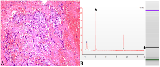 In order to determine the gestational or nongestational tumor origin, PCR looking for Y chromosome specific regions was performed. The PCR amplified the SRY (sex-determining region Y), as well as the followings Short Tandem Repeats (STR): DYS19, DYS392, and DYS439. The molecular studies identified the presence of Y chromosome regions in the tumor. It confirmed a gestational type of metastatic choriocarcinoma (Figure 2B). She was started on chemotherapy. EMA/CO (etoposide, methotrexate, actinomycin D, cyclophosphamide, and vincristine) regimen was chosen. Clinical and radiological improvements were achieved. After three cycles of chemotherapy, the hCG went down to 93 mIU/ml. She received one more cycle of chemotherapy as an outpatient. On the follow-up, there was not further evidence of the disease with normal values of hCG.