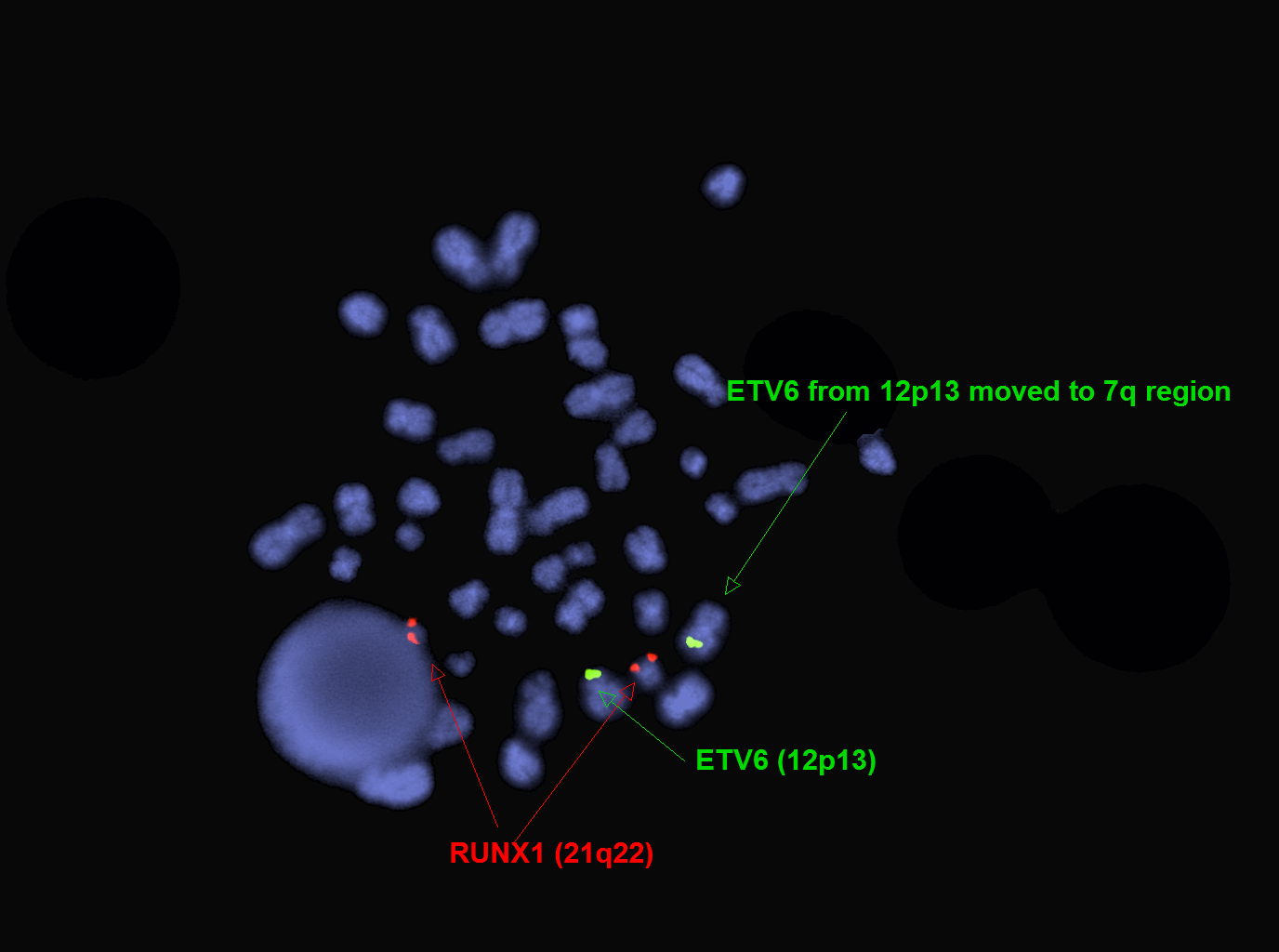 Cryptic and recurrent rearrangement of t(7;12) involving ETV6 locus has been identified in children of age two years or younger with various types of leukemia. Heterogeneity of the breakpoints ranging from 7q32 (very few) or q36 (frequently) and 12p13 have been reported in myeloid disorders.4–9 We report here a case of Pediatric Acute Erythroblastic Leukemia with a variant t(7;12) translocation involving three chromosomes 5, 7 and 12 with loss of the RB1 locus at 13q14 region of chromosome 13. Sequential metaphase FISH and cytogenetic were performed to identify the partner chromosomes in the ETV6 locus rearrangement.