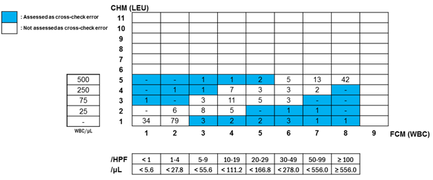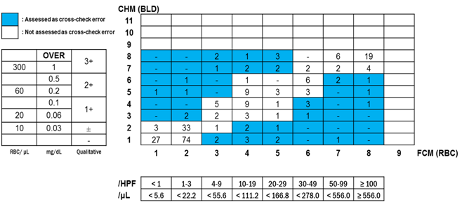 When the on-board crosscheck function is activated, certain related parameters of CHM and FCM units will be compared. A “crosscheck flag” is displayed if the results of those parameters show discrepancies. The cut-off values to trigger the crosscheck flag (rank values) are already set by the manufacturer, but user can make modifications in accordance with the laboratory needs. Optimal cut-off value for each user modified rank is set according to the reference values that suit the laboratory’s specific population. The greater the rank’s number, the higher the cut-off value. Samples with discrepant results should undergo further confirmation by manual microscopy. An example of crosscheck function application can be seen in Figure 1. If BLD result is 2+ (set as rank 7) and RBC result is 383.9/μl (set as rank 4), we will find that the intersecting line will be located at the white coloured cell. It means that there is a concordance between BLD and RBC. On the contrary, if we find a case which the intersecting line will be located at the blue coloured cell, it means that there is a discrepancy between BLD and RBC and UX-2000 will judge a discrepancy and give “crosscheck” warning. Blue and white colour are arbitary. Rank values applied in this study were developed according to the reference values that were used in our laboratory.