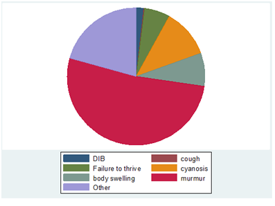 This study was conducted in a regional referral hospital in south western Uganda. This is a predominantly rural and poor region with recent limited access to diagnosis, no access to corrective procedures and constrained management for cardiac diseases in children this was a prospective study in the paediatrics department at a regional referral hospital in Uganda over a period of 20 months. All children from birth up to 12 years who were referred to or presented at the paediatrics department from different areas in the region for an index cardiac evaluation and had their transthoraxic echo done were included in the study. Age, sex, indication for echocardiography and cardiac diagnosis of every patient with an abnormal echocardiogram presenting to the clinic were recorded. Trans-thoracic two dimensional guided M-mode echo- cardiography using commercially available echocardiography machine (Siemens Colour Diagnostic Ultra sound System Model Acuson P300). We performed Echocardiographic examination in the sub costal, suprasternal views parasternal long axis, short axis and apical four chambers. Parameters recorded included presence and identification of structural heart defects, left ventricle diameter in diastole (LVIDD) and  left Atrium diameter(LAD), systolic dysfunction  (ejection Fraction <45%).