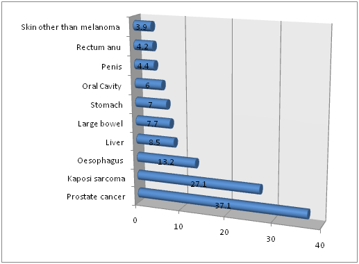 Limitations and challenges: There has been a general upward trend in cancer incidence in Uganda since the establishment of a cancer registry in Uganda (1954) with some cancers such as breast and prostate cancer trebling in incidence rate. There are other cancers such as liver which have remained stable over years while some cancers such as Kaposi’s sarcoma and non-Hodgkin’s Lymphoma suddenly increased in incidence in the era of HIV/AIDS pandemic. There are a few cancers such as penile and urinary bladder cancer on a downward trend. The data on cancer shown in this paper (Figures 1-3) is obtained from Kampala Cancer Registry, a population-based cancer registry, covering only 10% of Ugandan population. The challenge is that these data may not exactly represent the remaining 90% of the population. Therefore, there is an urgent need to establish regional cancer registries. Another challenge is the diagnostic capabilities of diagnosing cancer in terms of human resource and equipment since with current management of cancer there is need to invest in molecular techniques of diagnosing various types of cancer. There is also a challenge in establishing cancer prevention and control policies and programs. Currently there are no established screening programs for common cancer in Uganda and therefore patients present late in health units.