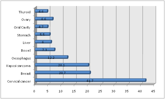 The incidence of malignant diseases is increasing globally, particularly in the developing countries as shown by recent cancer statistics from the World Health Organization Reports. It is anticipated that with increase in life expectancy consequent upon improved standard of living and increasing industrialization, the burden of cancer in sub-Saharan Africa is likely to increase in the new millennium. Cancer registries routinely provide quality data on the incidence and prevalence of cancer in a population, on the common types of cancer reported and their trends. This allows for effective planning of prevention measures, which include screening programs and cost effective cancer management. Cancer registry data collected from a given population can also be used in research programs and for comparisons with other populations in different regions of the world. The burden of cervical cancer in East Africa is extremely high, where the costs of nationwide organized cytology screening have been a significant limitation. The use of Pap testing for cytology-based screening has been highly effective in preventing cervical cancer in developed countries and will most likely be effective in countries where screening is limited or nonexistent.21 Hence, the use of alternative screening modalities, such as visual inspection of the cervix aided by acetic acid (VIA) with or without magnification, is currently under evaluation in the region. In addition, prophylactic human papillomavirus (HPV) vaccination for the prevention of infection and related disease is being considered as an additional cervical cancer control strategy. A concern against HPV vaccination is the issue that it could promote or encourage unsafe sexual behavior among adolescents.22 However the predominant reason for non-acceptance of the vaccine is its current high cost.