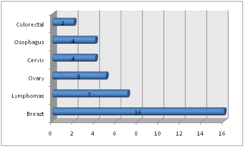 The National Cancer Institute, University of Gezira (NCI-UG), is a special center established in 1994 by the University of Gezira (UG) in Wad Medani, Sudan. UG is a community oriented University established in 1975, with a main objective of rural development. UG is located in the center of Sudan in Gezira state, the most densely populated state, which harbors the Blue Nile-irrigated Gezira Scheme. NCI-UG was established to meet the community’s needs in the fields of Oncology, Nuclear Medicine, Medical Imaging and Molecular Biology, integrating activities of research, service and training. The uniqueness of the approach of NCI-UG in implementing these complementary functions made the institute’s environment quite satisfactory in providing medical services, good quality research, and training programs.17 NCI-UG with the support of the International Agency for Research on Cancer (IARC), established in 2006 the Gezira Cancer Registry, the first population-based cancer registry in the country. The Gezira Cancer Registry, located at the NCI-UG in Wad Medani, the capital city of Gezira State, covers only Gezira State (Central Sudan, 26,075 km2), serving about four million people (10% of the total Sudanese population). Figures 6-8 detail the most common male, female and pediatric cancers in Central Sudan respectively.