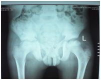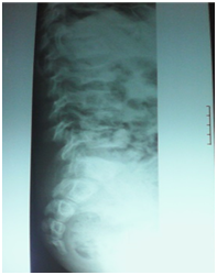 A 12-year-old boy was diagnosed with Sickle Cell Disease (SCD) with genotype SS about one year prior to. He presented with 2 months history of inability to walk and pain in both legs to Komfo Anokye Teaching Hospital in Kumasi, Ghana. The complaints were associated with marked weight loss and generalized body pain. He had been admitted about 2 weeks prior to the onset of current symptoms on account of abdominal pain and anaemia where he was haemo-transfused, given medications and subsequently discharged. There were no other significant findings in the past medical history, immunization history, nutritional and developmental histories. On examination he was found to be wasted (Weight for Height z-score <-3SD), pale, afebrile and anicteric. He had palpable axillary and inguinal lymph nodes (each measuring about 1cm to 1.5cm, mobile, non-tender and not matted). Vital signs were normal on admission. Other significant examination findings were obvious swelling of the right leg which was warm to touch, erythematous and tender on palpation. He had a gibbus deformity of the lower thoracic spine with no remarkable neurological findings in the lower limbs. A diagnosis of SCD with vaso-occlusive crises and cellulitis of the right leg was made with differential diagnosis of osteomyelitis, Deep Vein Thrombosis and Potts disease. Initial investigations revealed WBC of 13.51 X 109/dl with Neutrophils 8.83 (65.3%) Lymphocytes 4.27 (31.6%) and Monocytes 0.25(1.9%), Hemoglobin 7.1g/dl, MCV-70.7, MCH-22.4, Platelets: 538, ESR-117, INR-1.05, Prothrombin Time-14.3secs and blood sugar-6.5mmol/L. Malaria parasites were not seen on the blood smear and patient was negative for Retro-Viral Screen for HIV. Other investigations included Doppler Ultrasound, Chest X-ray, Pelvic x-ray, Thoraco-lumbo-sacral spine X-ray (Figure 1-10). Blood culture and sensitivity could not be done at the time of admission as microbiology service in the hospital had a brief logistic challenge. Radiological findings revealed the following: Reduction in the vertebral body heights of T7-T10 with associated reduction in the intervertebral disc spaces and crowding of the posterior ribs. A paravertebral soft tissue mass extending from T4 vertebral level to T11. Coarse trabeculation and sclerosis of the ribs noted. Expansion of the anterior end of the left 8th rib with ill-defined lytic areas. Buckling of the cortex of the lateral aspect of the left 9th rib, suggestive of a fracture. The imaged portion of the proximal humerus shows periarticular osteopenia. Also noted was relatively small left humeral head with left glenohumeral joint space. There are patchy homogenous opacities in both lung fields predominantly in the lower zones. There was associated silhouetting of the hemi diaphragms bilaterally and the cardiac shadow. There was generalized sclerosis of the imaged pelvic bones with coarsening of the trabeculae. The right femoral head was deformed and expanded with sclerosis and lytic areas within. There was associated narrowing of the right hip joint space. The left femoral head also showed patchy lucencies. No deformity of the left femoral head seen. The left hip joint space appeared normal. Also noted was fusion of the sacroiliac joints bilaterally. There was diffuse sclerosis of the imaged vertebrae with coarse trabeculae. The vertebral endplates of L1/L2 and L3/L4 showed sharp depression at the margins with a flat base centrally giving it the H shaped appearance. Also noted were ill-defined lytic areas in the L3 to L5 vertebrae with associated end plate irregularities and reduced intervertebral disc spaces at L3/L4 and L4/L5. No paravertebral soft tissue mass seen. No fracture or listhesis seen. Changes of the thoracic spine were described under the chest x-ray.