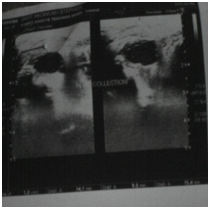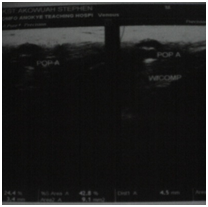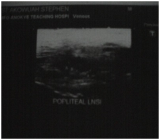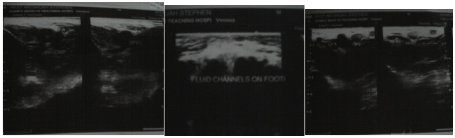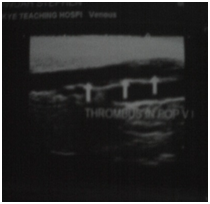 These radiological diagnostic features were suggestive of sickle cell disease with Thoracolumbar spondylodiscitis, likely pyogenic; Bilateral Avascular Necrosis of the femoral head (early on the left); Septic arthritis of the right hip and left shoulder joint; Osteomyelitis of the left 8th and 9th ribs. Doppler Ultrasound of the lower limb revealed the following: The right common femoral and superficial femoral veins were of normal lumen with good wall to wall compressibility, good colour doppler and spectral wave form properties. The right popliteal and posterior tibial veins however showed extensive echogenic intraluminal-filling defect with resultant loss of wall-to-wall compressibility (percentage stenosis 76%). The accompanying arteries were of normal size and caliber and showed good colour doppler and spectral properties. There was thickening of the subcutaneous tissue with dilated fluid channels seen in the right foot. Inguinal as well as popliteal lymph nodes with retention of their fatty hilum noted averaging 0.9*0.5cm. Also noted was a 1.4*0.9*1.5cm (volume about 1.0ml) anechoic collection with low-level internal echoes at the medial aspect of the proximal thigh muscles; suggestive of inflammatory changes. Based on the Doppler findings a clinical diagnosis of Right Popliteal and Posterior Tibial Vein Thrombosis with Pyomyositis in a Sickle Cell Disease patient was considered and patient was subsequently administered subcutaneous Enoxaparin 40mg daily as well as Warfarin 3mg nocte, IV Clindamycin 150mg qid, IV Ciprofloxacin. After 2 days of Warfarin and Enoxaparin, INR and PT were repeated and results were 1.1 and 15.1s respectively. The child was followed up closely for four weeks and subsequently discharge. A repeat Doppler finding revealed a completely resolved thrombus with no evidence of DVT.