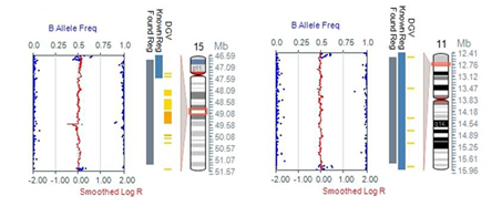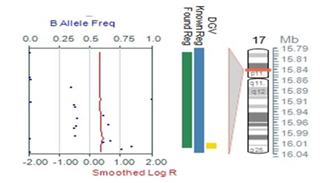 The results showed a female karyotype with a copy number change, duplication at cytoband 17p12p11.2 with clinical significance and also revealed a copy neutral LOHs on chromosomes 11 and 15. Duplication of 226Kb at cytoband 17p12p11.2 was detected (Figure 2). Also, long continuous stretch of copy neutral LOH (Loss of Heterozygosity) on chromosomes 11 and 15 representing about 0.25% of the genome was observed (Figure 3). Other three small aberrations in the form of deletions were seen in chromosomes 5, 7 and 8.