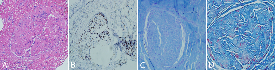 Figure 1 Sural Nerve Biopsy A) H&E stained sections show sural nerve and connective tissues. There is significant fibrosis in the peri-, epi-, and endoneurium. B) Neurofilament immunostain displays evenly distributed and moderately diminished complement of axons. C) Toluidine stained sections display no thickly myelinated fibers and no onion bulb Schwann cell formations. D) Trichrome stain shows no large myelinated fibers (Original magnification X400, A-D).