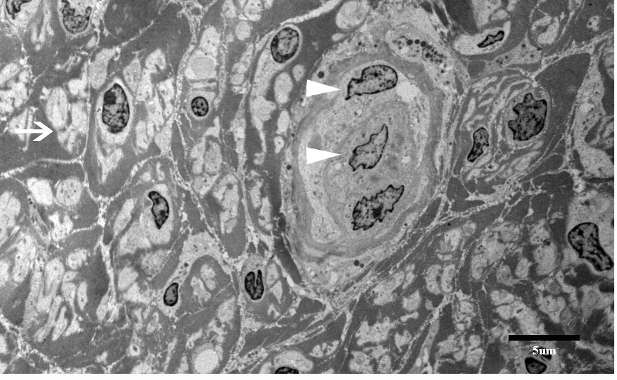 Figure 2 Ultrastructure of sural nerve shows no discernible thick or thin myelination present around axons (Single arrow). Unmyelinated fibers have loosely arranged membrane around them and Schwann cell nuclei are present (arrow head). No supernumerary Schwann cell onion bulb formations are seen. (X5000).