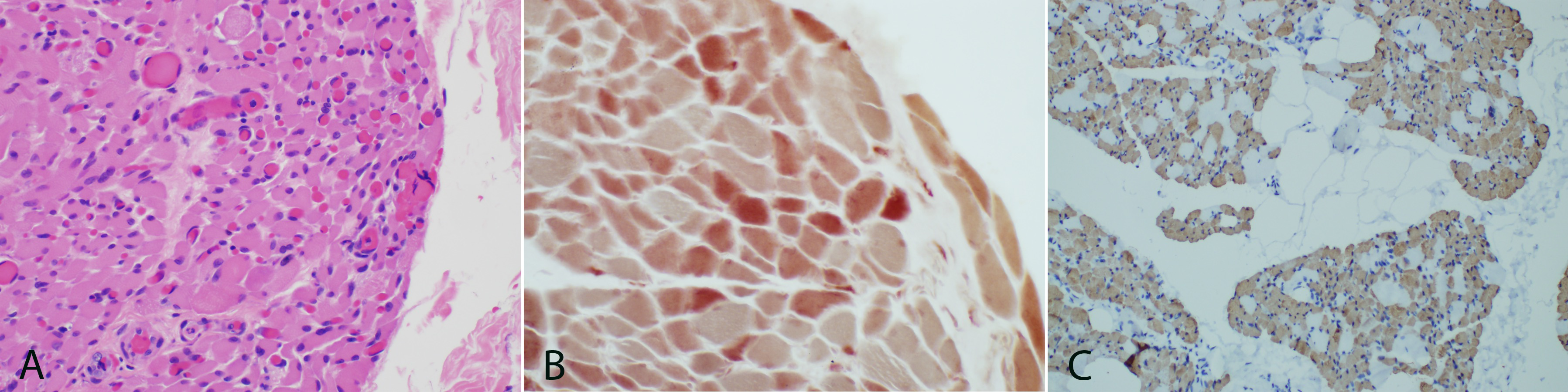 The patient at time of biopsy was an 18 year old white female with a longstanding history of failure to thrive and developmental delay. She met all milestones until about 5 years of age, when she began having difficulty maintaining normal weight. At age 13 a wrist xray for bone age suggested a delayed bone development age. She was treated by an endocrinologist for possible growth hormone deficiency due to small stature and low weight, though the growth hormone therapy did not prove successful to maintain her growth. Laboratory studies, focused primary on nutritional and endocrine functions, were largely normal, though plasma metanephrines were sometimes found to be 1.5-2 times normal values. Creatinine phosphokinase studies were never obtained and muscle and nerve conduction studies never performed. She subsequently developed severe scoliosis, requiring hardware placement that was removed later due to infection. Initial presentation of the patient to Children’s of Alabama (COA) occurred as abdominal pain with vomiting that “turned black” without diarrhea, and she complained for several days of fever, back pain, foul odor of urine. Radiology evaluation revealed pneumotosis and markedly distended stomach into the pelvis. She was treated with TPN followed by trans-pyloric then oral feeds. She achieved minimal weight gain. She was ruled out from superior mesenteric artery syndrome and carnitine deficiency. At one point, mitochondrial neurogastrointestinal encephalopathy (MNGIE) was considered, but this was much later in her course, and genetic testing did not confirm the diagnosis. She was discharged and transferred to an adolescent treatment facility in Virginia for treatment of complex medical problem and a suspected eating disorder. At age 18, a decision was made to place a G-tube, and at that time an observant surgeon suggested a nerve and muscle biopsy should be performed. The biopsy was sent to Bostwick/American International Pathology Labs and consultation requested from Neuropathology at Medstar Georgetown University Hospital. A diagnosis of congenital amyelination/hypomyelination with associated myopathy was given. Genetic studies to look for specific myelination related gene defects were not undertaken. Shortly after biopsy, she returned to Children’s of Alabama with respiratory failure requiring ventilator support. She struggled with intermittent ventilator associated infections, worsening pulmonary status, dysrhythmias, chronic malnutrition and deconditioning. An attempt to wean her from the ventilator resulted in immediate desaturations and bradycardia leading to a code event with chest compressions and pharmacological intervention. After consulting with a neurologist, the family decided to withdraw care and allowed her to pass peacefully. Permission to perform an autopsy was not obtained.