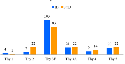 Following cyto-histological correlation, we found that the sensitivity in WGH and JRH was 73% and 80%, respectively. However, the specificity in WGH was 74%, which is below the recommended RCPath range (76-100%), whilst it was much higher in JRH at 83%. The PPV at both sites was within the recommended ranges for Thy3a, Thy3f, Thy4 and Thy5. In particular, the PPV for Thy5 by the ID and SOD was 95% and 100%, respectively.