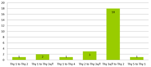 Five cases were downgraded, including two cases downgraded from Thy5 to Thy4 with the histological diagnosis in each case being papillary thyroid carcinoma. Two cases were appropriately downgraded from Thy4 to Thy 3f with subsequent histology showing follicular adenomas. One case was downgraded from Thy4 to Thy 3f with subsequent histology showing multinodular goitre.