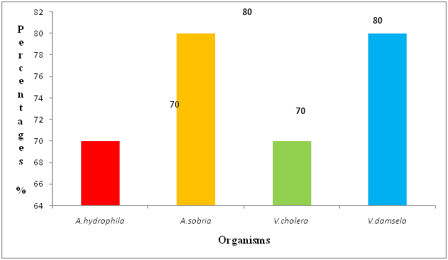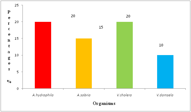 V. cholerae has also exhibited antibiotic resistance against Amikacin, Amoxcillin, Ampicillin, Carbenicillin, Cefamandole, Cefazolin, Cefixime, Ciprofloxacin, Erythromycin, Framtomycin, Galtifloxcin, Methicillin, Novomycin, Neomycin, Ofloxacin antibiotics as V. damsela. In addition to that resistance was noted for these antibiotics. Resistant development against Ampicillin, Carbenicillin, Cefamandole, Cefazolin, Cefixime, Ciprofloxacin Erythromycin, Framtomycin, Novomycin was noted in A. hydrophila, A. sobria cholerae and V. damsala. Intermediate effect was shown by Doxycycline, Galtifloxcin, and Ofloxacin in A. sobria. Amikacin, Doxycycline, Galtifloxcin, Neomycin in A.hydrophila. Cefixime, Chloramphenicol, Galtifloxcin, Gentamycin in V. damsela. Doxycycline, Galtifloxcin V. cholerae. Levofloxacin was found to be effective over all the four species tested. All the other 19 antibiotics were found to inhibit only 25% of the organism employed tested.