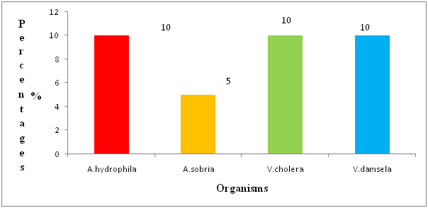 Antibiotic susceptibility pattern, in the four recovered gram negative bacterial species belonging to Aeromonas sp and Vibrio sp was checked against 20 antibiotics coming under different chemicals and showing diverse mode of action. Kirby - Bauer method was employed for determining the efficacy of selected antibiotics. A mixed response was noted in all the four species tested. Table 1 & Table 5 exploring the effect of antibiotics and percentage of resistance developed in the bacteria. The minimum percent of resistance was 70 and the maximum percent was 50. Percentage of resistance was found to be similar between A. sobria and V. cholerae. The low range of resistance was noted in A. hydrophila and V. damsela. Even though an uniformity was noted in the percentage of resistance between A. sobria and V. cholerae at the higher range and A .hydrophila and V .damsela t the low range, A difference in the nature of antibiotics to which resistant developed was noted in the organisms. A. sobria has shown resistant development against (Amikacin, Amoxicillin, Ampicillin, Carbenicillin, Cefamandole, Cefazolin, Cefixime, Chlromphenicol, Ciprofloxacin, Erythromycin, Framtomycin, Gentamycin, Kanamycin, Methicillin, Neomycin and Novomycin). A. hydrophila also exhibited antibiotic resistance against Amoxicillin, Ampicillin, Carbenicillin, Cefamandole, Cefazolin, Cefixime, Chlromphenicol, Ciprofloxacin, Erythromycin, Framtomycin, Kanamycin, Methicillin, Novomycin and Ofloxacinas A. sobria. In addition to that, resistance was noted for these antibiotics. V. damsela has shown resistant development against Amoxcillin, Ampicillin, Carbenicillin, Cefamandole, Cefazolin, Ciprofloxacin, Erythromycin, Framtomycin, kanamycin, Methicillin, Novomycin, Neomycin and Novomycin antibiotics.