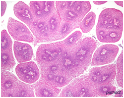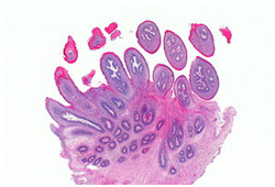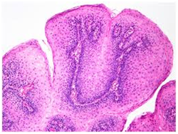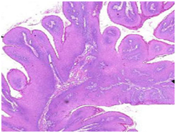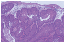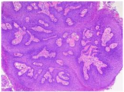 Histopathological statutes: The squamous epithelium displays finger like projections, the epithelial maturation pattern is orderly with epithelial hyperkeratosis. Spinous epithelial cells may depict cytoplasmic vacuolation with pale, clear perinuclear haloes, nuclear pyknosis and infrequent basilar hyperplasia. Oral squamous papillomas frequently display koilocytosis on account of the co-existent cytopathic influence. Atypical nuclear alterations may be exemplified; particularly with immune-compromised (HIV positive) individuals.9 The epithelium displays a typical maturation pattern with prominent hyperkeratosis. Epithelial to basal cell quantification is moderate (basilar hyperplasia) along with an extensive koilocytic transition.1 Virally induced carcinomas are the poorly differentiated, non-keratinizing tumours and may be enunciated in the tonsils of sexually active young men. Majority of the tumours elucidate the p16 proteins. Oro-pharyngeal cancers which are reactive for human papilloma virus (HPV) frequently depict basaloid morphology. Apart from a viral genesis, squamous papillomas may ensue from mechanical irritation or may be genetically determined as a constituent of Cowden’s syndrome.